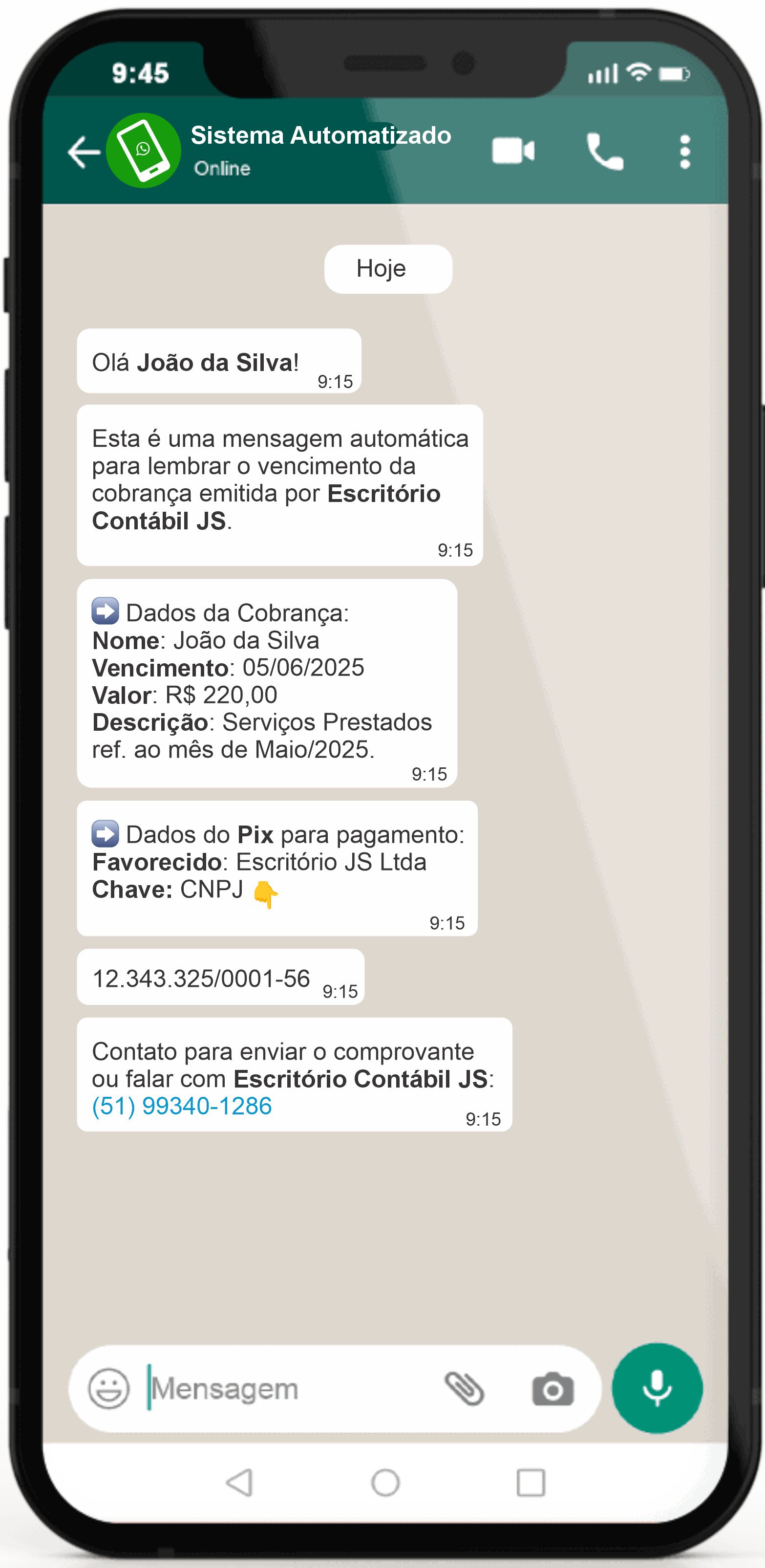 Na mensagem constará todos os dados da cobrança e também a sua chave Pix, para que o cliente efetue o pagamento diretamente para você.